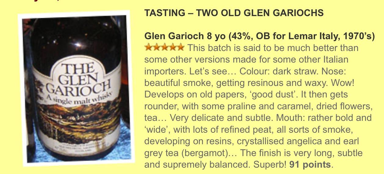 於70年代裝瓶的Glen Garioch,擁有超過8年的酒液,並是於意大利的Lemar進口。不要少看這「只有」個位數8年的Glen Garioch,擁有著豐富的香梨、蜜蠟、礦物、輕微泥煤等等風味。是一款明顯於舊世代風味的威士忌,Glen Garioch亦曾是煙燻泥煤的一代,而當中煙燻泥煤輕微,略感像Springbank般帶點礦物味道。此作更曾於Whiskyfun中取得91分,當中Serge也表示當中感受到明顯的泥煤味道。