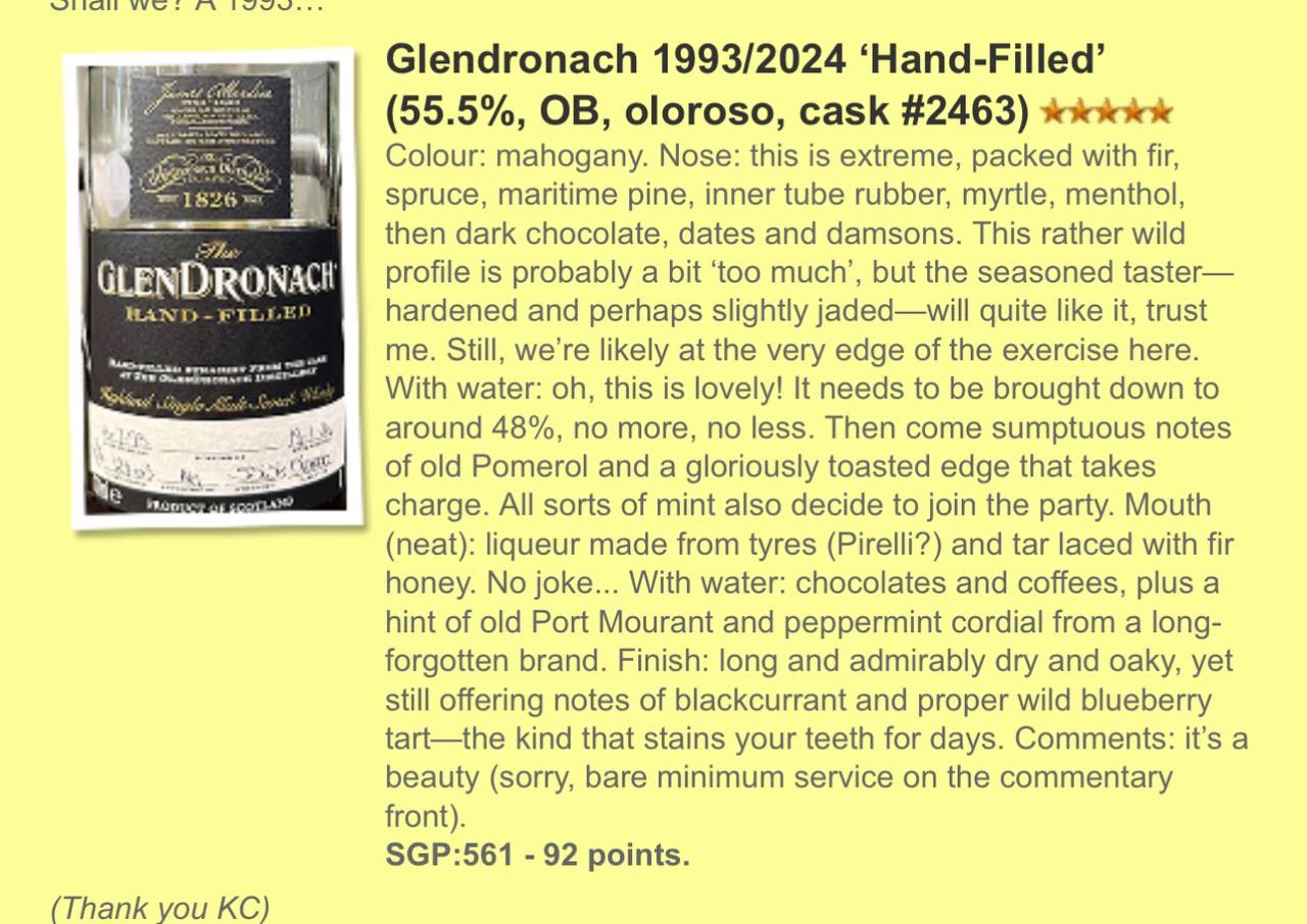 Glendronach其中一個公認的Golden Vintage為1993年,2023年前市場湧現過很多膾炙人口的1993年作品,不少桶號更是家傳戶曉。然而,踏入2023年以後,隨著1993年所餘下的桶不多,而且1993年也步入30年的大關。2023年以後,Glendronach大幅減少1993年的單桶出品,在2024年更只得2桶,2025年?暫時一桶也未見過。可見Brown Forman即使在威士忌市場下行之際,依家十分惜賣1993年的Glendronach。