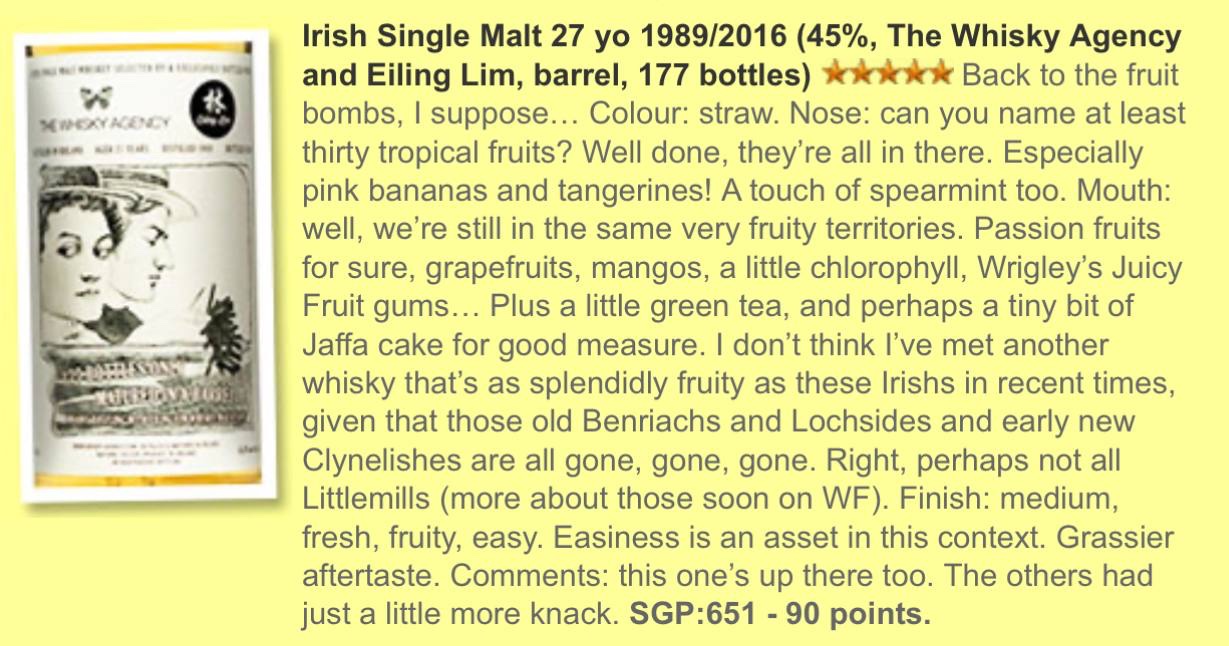 今次為大家介紹Eiling Lim 與TWA共同挑選的Irish 單桶,單憑味道已知是Cooley,於Barrel 熟成27年,擁有著極強的芒果汁、蜜糖味甚重、中等蜜蠟感,當中亦包含蜜瓜、檸檬等味道,而結尾亦沒有任何Overmarture 的木澀感。完美展現當年Irish 的水果感如何征服眾多威士忌愛好者。當中亦於Whiskyfun 中取得90分,當中Serge 亦無過多形容詞修飾,就是主要一個字,「Fruity」。