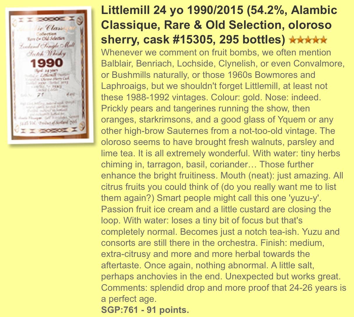 今天為大家帶來由德國裝瓶廠商Alambic Classique所挑選的Littlemill,在Oloroso Sherry Cask內熟成24年,桶號#15305。帶有梨、堅果、貴腐酒的甜、熱帶水果、雲喱拿、吉士等等誘人味道。絕對是一款擁有多重水果味道夾雜於一身的Littlemill,曾於Whiskyfun中得到了91分的高分,Serge更指出眾多Fruit Bomb之中,Littlemill總是被忽略的那一家。這支Littlemill意外地出色,24-26年是他認為最適年份的Littlemill,當然這支單桶作品亦是其中之一。