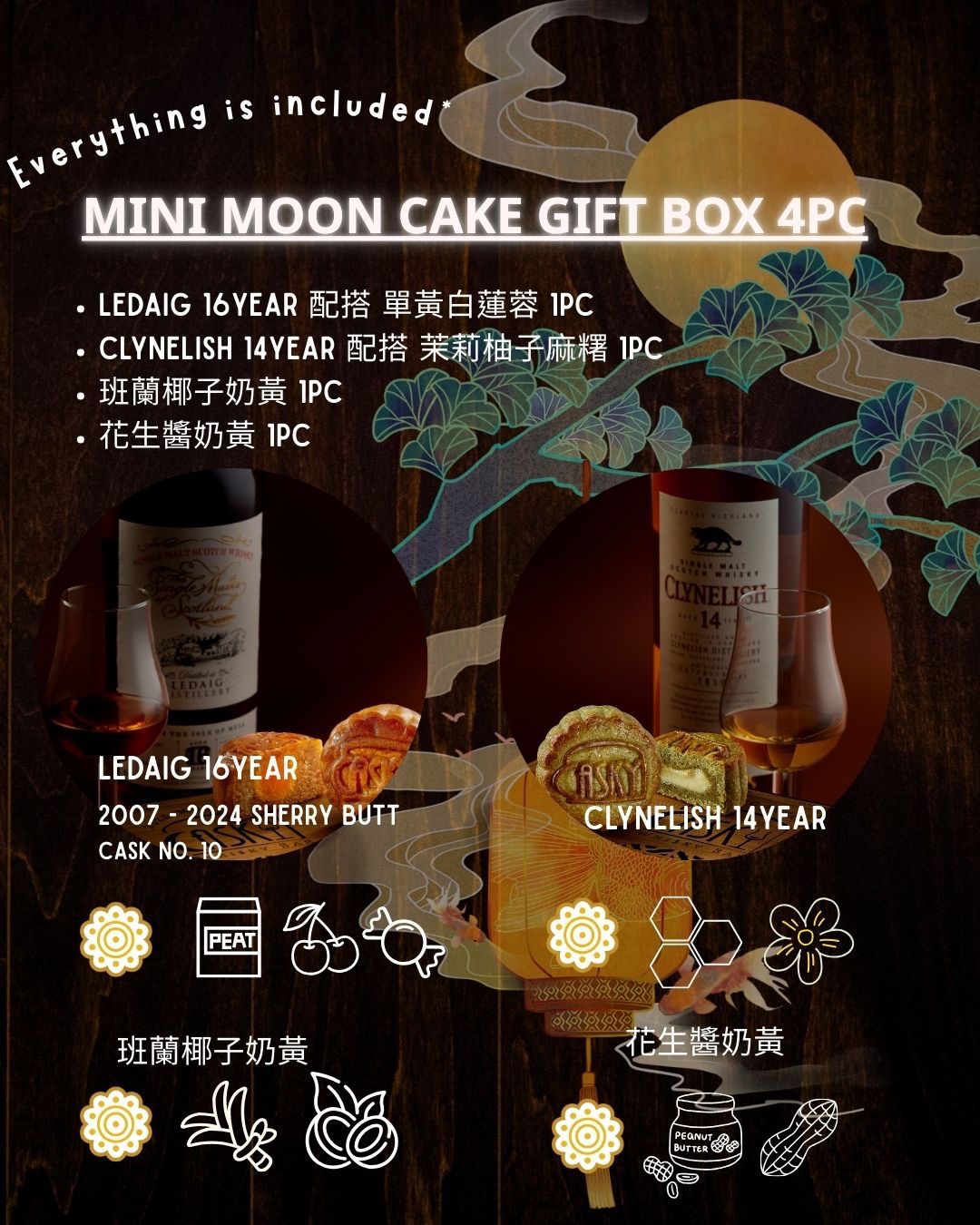 今年一樣本地香港純手工製造, 小朋友先做選擇, 今年創新又有傳統又有.傳統啲單黃白蓮蓉配Ledaig 16年 Sherry Cask之外, 亦都帶嚟冇咁Heavy嘅茉莉柚子麻糬月餅配Clynelish 14.