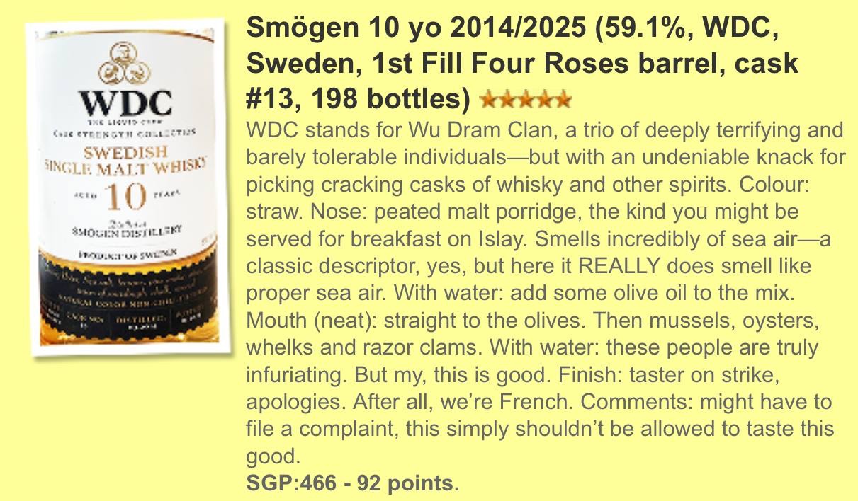 剛剛於Whiskyfun 中取得92分,Serge 也笑言Smogen 是他躋身十強的歐洲酒廠。於我們品飲經驗。不是很多非蘇格蘭的歐美威士忌能進入大家眼球之中,今次的Smogen絕對會是大家的選擇。十年單桶新廠,已經比其他眾多新廠相宜,再加上92高分的認證,絕不失望。現在起您在The Good Spirits可以找得到。