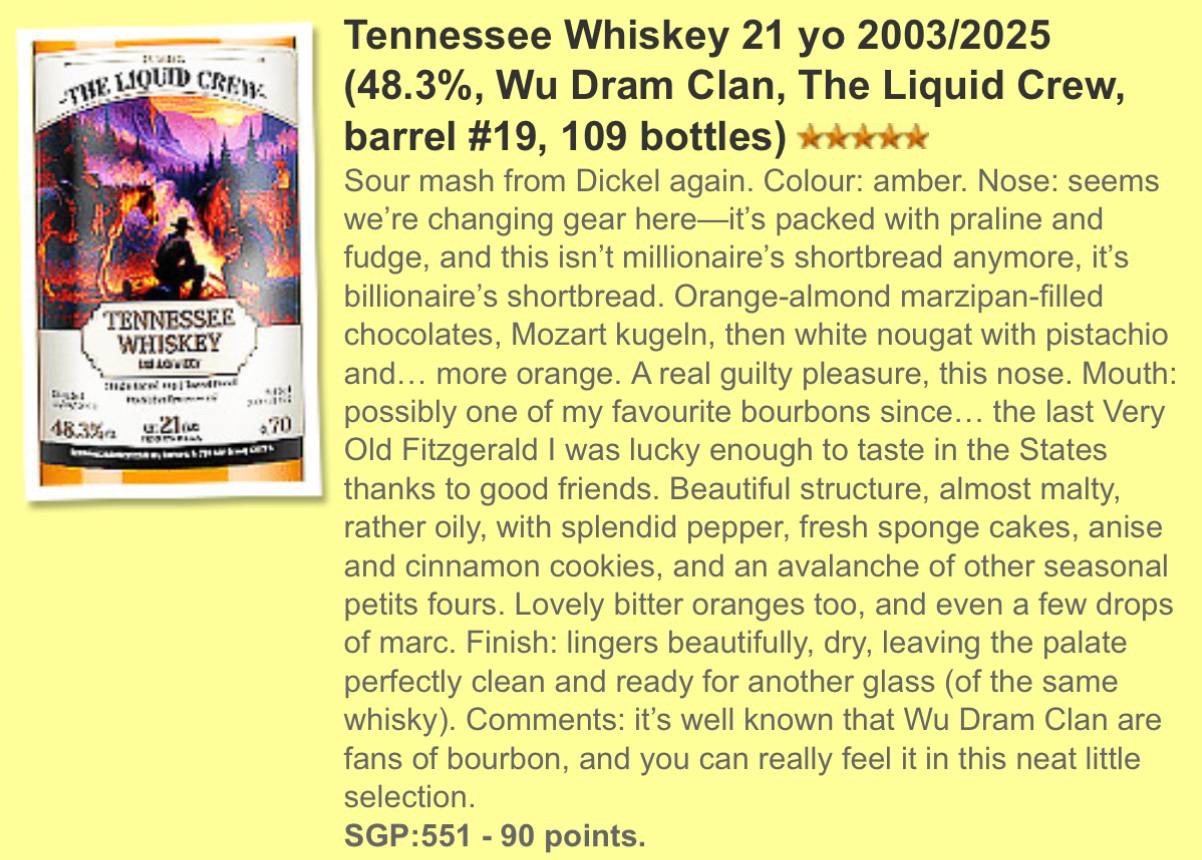 今次由Wu Dram Clan 挑選的Tennessee Whiskey單桶,Wu Dram Clan告知這是來自George Dickel 酒廠的單桶、於American Barrel 熟成21年,擁有著焦糖、蜜糖、Maple Syrup、香橙及肉桂味。以美國的氣候來說,超過21年的美國威士忌也乃是非常難得的年份。