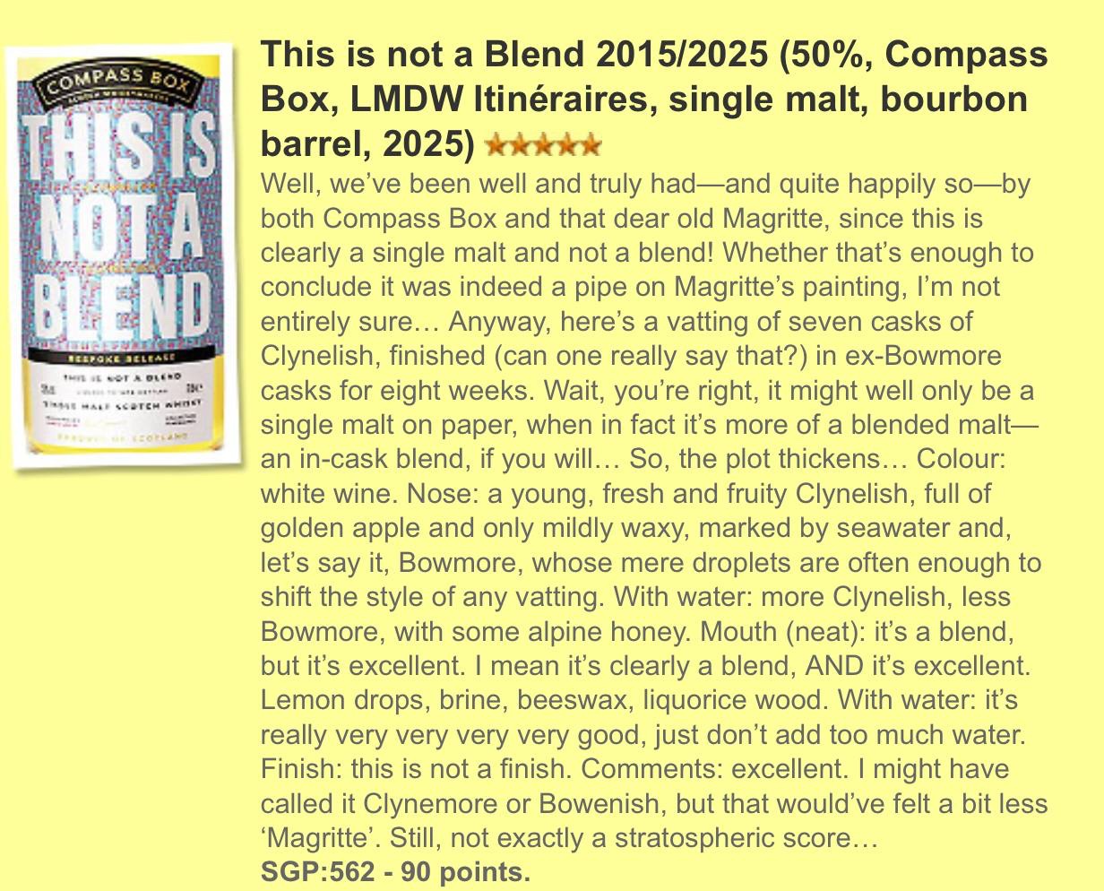 名字This is not a blend,用上於2015年的Clynelish,但豈止這麼簡單,同時Compass Box 於2025年選用之前推出的剩餘酒桶,Bowmore 2002,即有23年 ,清空酒桶後再將Clynelish 進行二次熟成。雖然Compass Box 寫上 Emptied Six Bowmore Barrels”,但這種把戲於Bowmore Barrels仍會殘留不少之前盛載的酒液,然後再與Clynelish 酒液混合一起。擁有著Clynelish 的蜜蠟、蜜糖,同時亦充滿海風、輕微煙燻、奶油,是一具有不少Bowmore DNA 的果味Clynelish,亦於Whiskyfun 中取得90分,亦以”Clynemore” 或 “Bowenish”去稱呼其款式。可想而知當中Bowmore Barrel 給予的風味也不少。